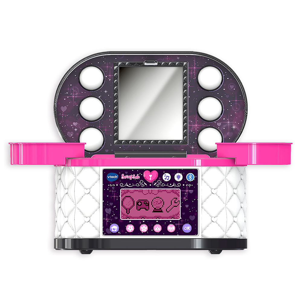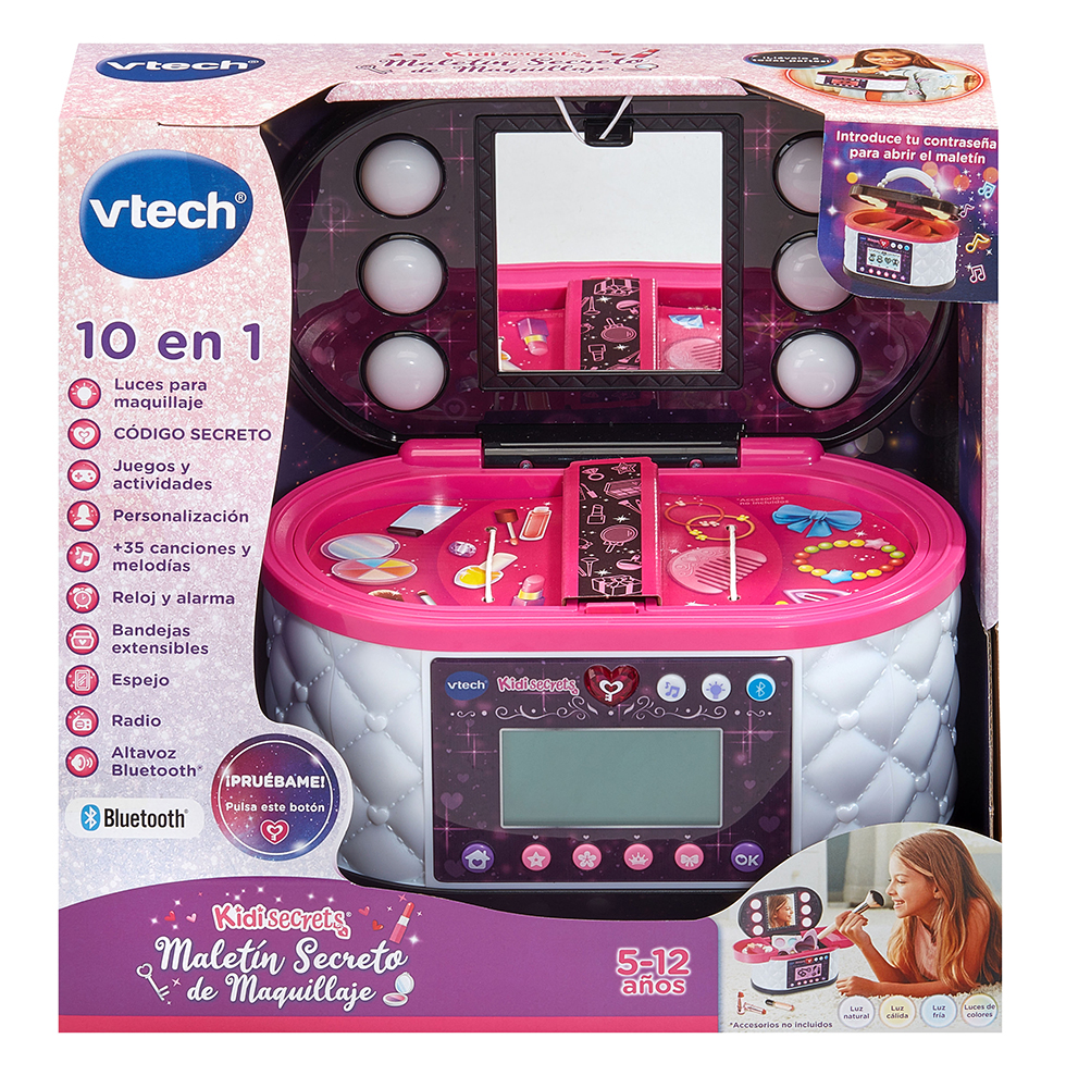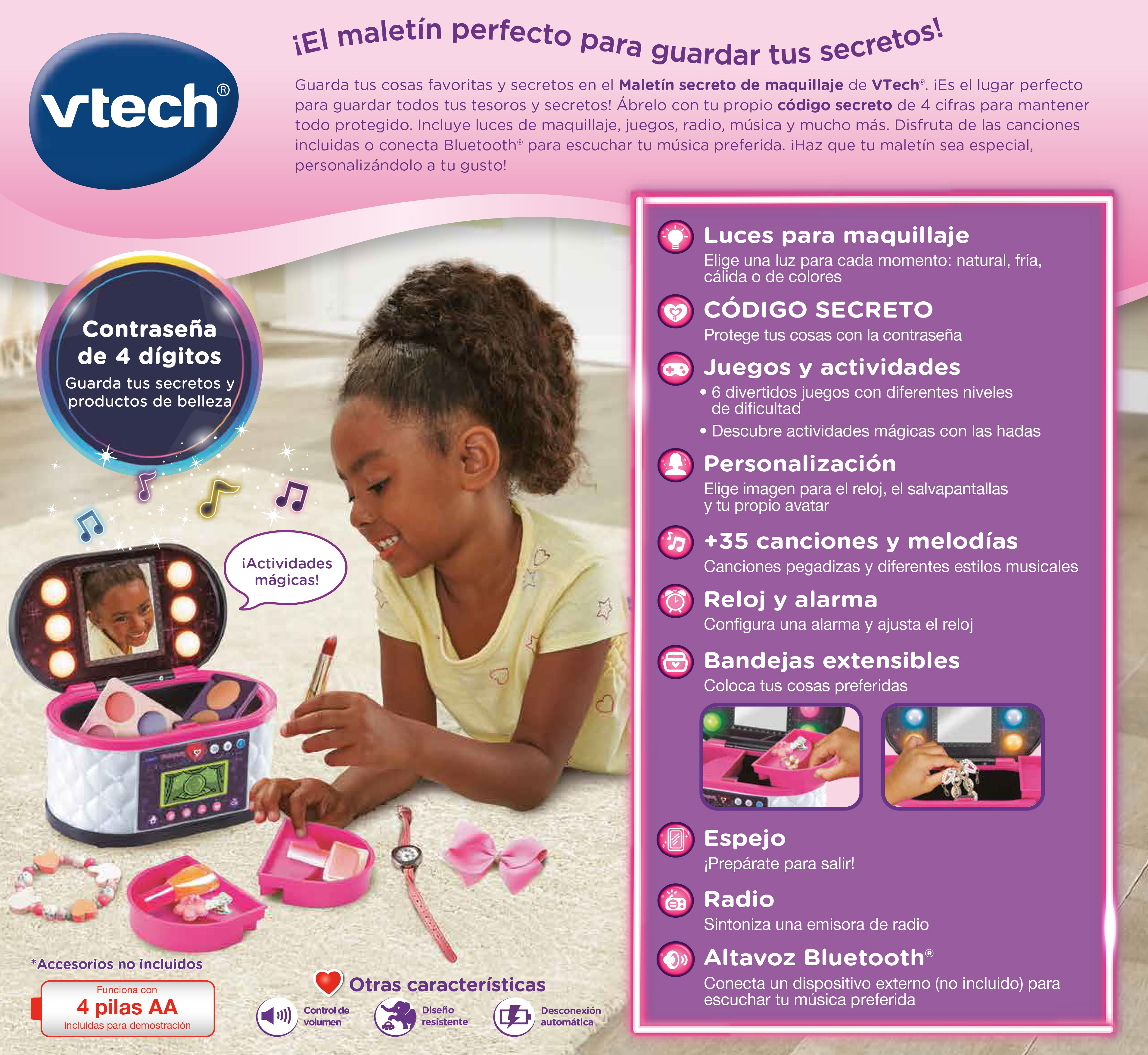 Un tesoro portátil donde guardar secretos y desatar la creatividad: al teclear su código personal, la tapa se abre y los LED de colores iluminan el espejo, invitando a probar accesorios o maquillaje y reforzando la autonomía. La pantalla LCD muestra hora y alarma para aprender a organizar el tiempo, revela el código si lo olvidas y propone animaciones y minijuegos de moda y maquillaje que enseñan números y ortografía sin darse cuenta. Tres compartimentos —uno grande y dos bandejas— ayudan a clasificar joyas y recuerdos, fomentando el orden. Conecta el móvil por Bluetooth o sintoniza la radio para escuchar música mientras diseñas tu avatar y cambias sus looks, desarrollando la imaginación y el sentido estético. Asa integrada para llevarlo a todas partes y botones de personalización que convierten cada sesión en una pasarela de diversión segura y privada.