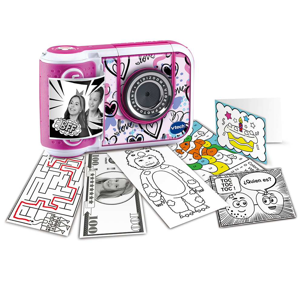 - Características: Pantalla a color 2.4", resolución fotos 5 MP, impresión instantánea en blanco y negro, imprime papel térmico y adhesivo, no necesita tinta para imprimir, más de 110 plantillas para recortar e imprimir, más de 40 efectos, marcos y sellos.