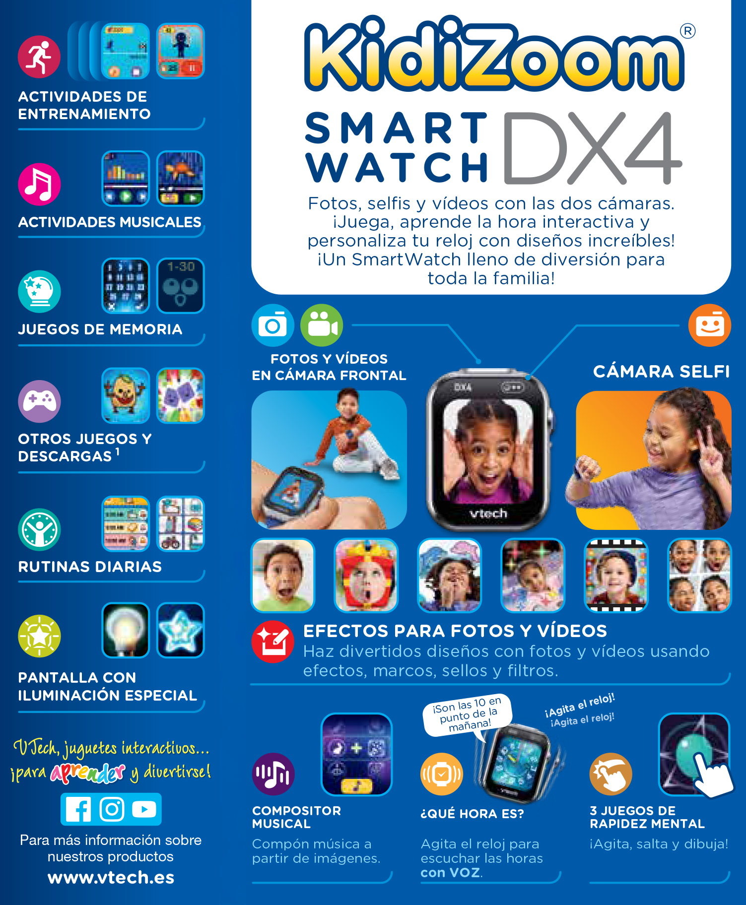 INCORPORA DOS CÁMARAS que permiten capturar cada momento, desde vídeos hasta selfis. Memoria interna de 256 MB. Reloj infantil RESISTENTE A GOLPES y salpicaduras (no sumergir).