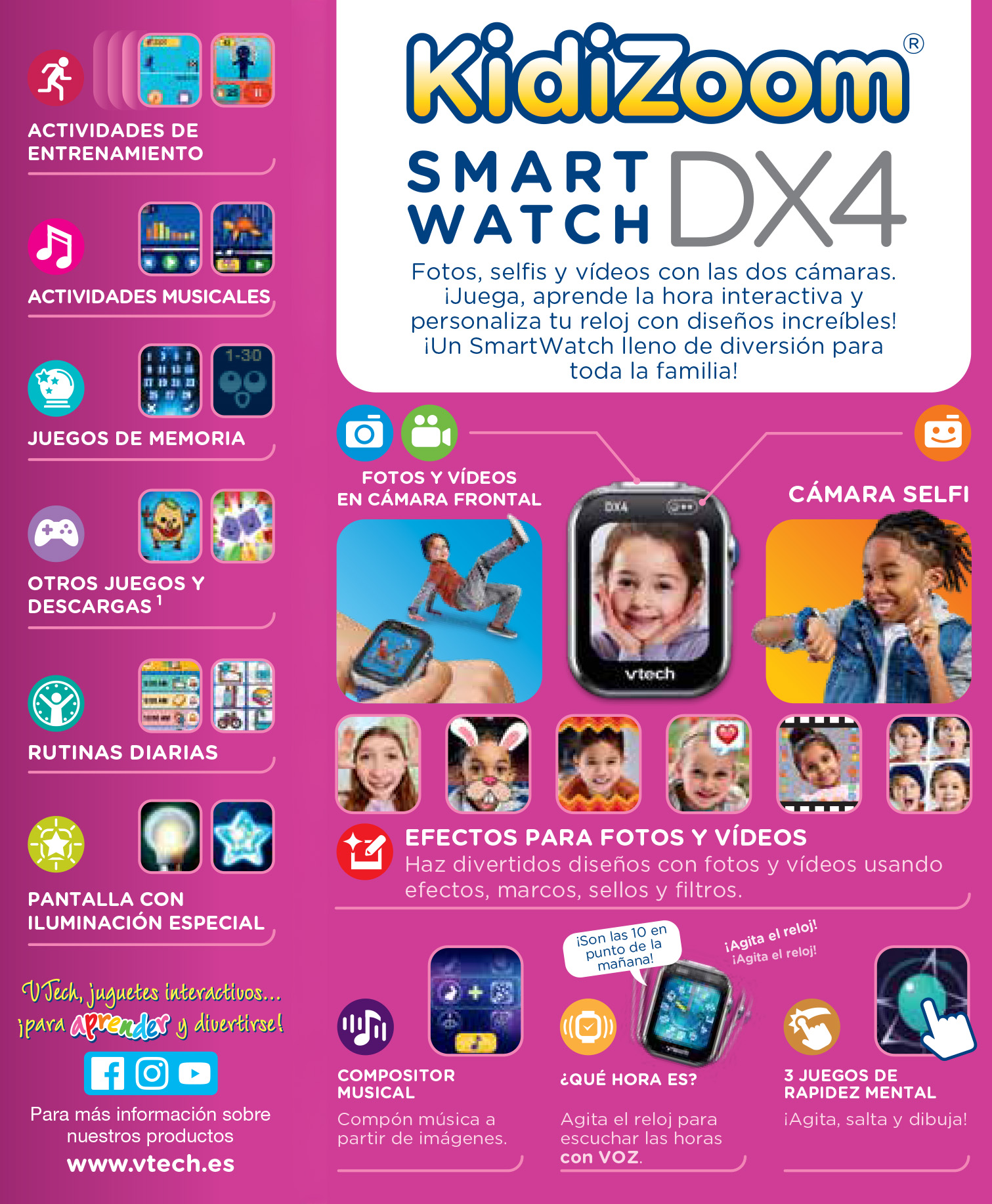 INCORPORA DOS CÁMARAS que permiten capturar cada momento, desde vídeos hasta selfis. Memoria interna de 256 MB. Reloj infantil RESISTENTE A GOLPES y salpicaduras (no sumergir).