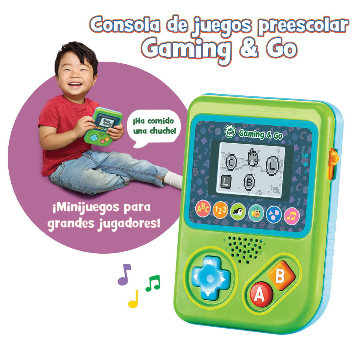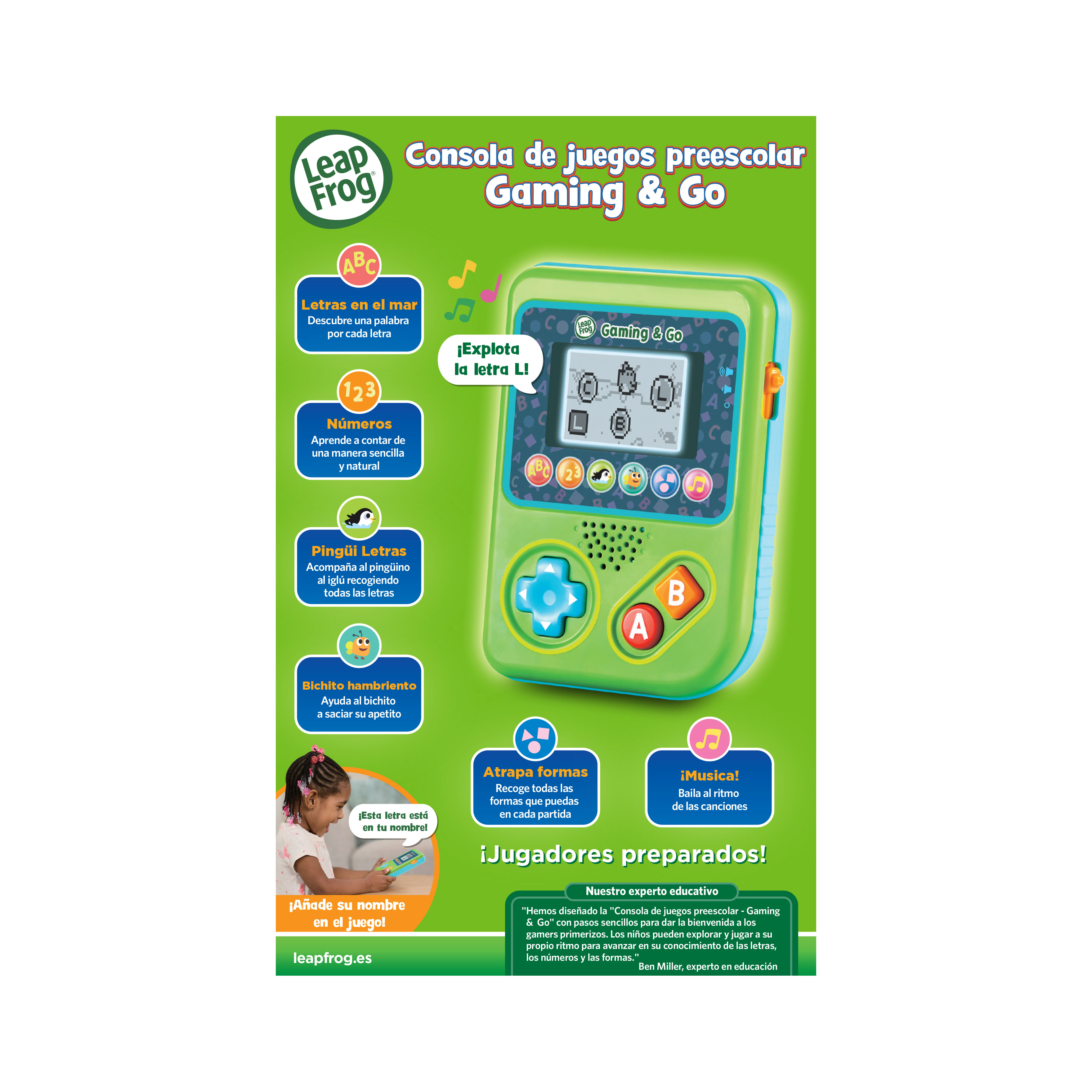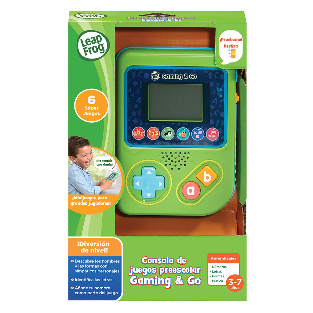 Consola preescolar de juegos para niños +3 años. Dispositivo de juegos de fácil manejo por sus grandes teclas de colores. Incluye 6 juegos educativos: letras y palabras con animaciones, números y conteo, habilidades espaciales, formas y música con canciones divertidas. Pantalla LCD, control de volumen y desconexión automática.