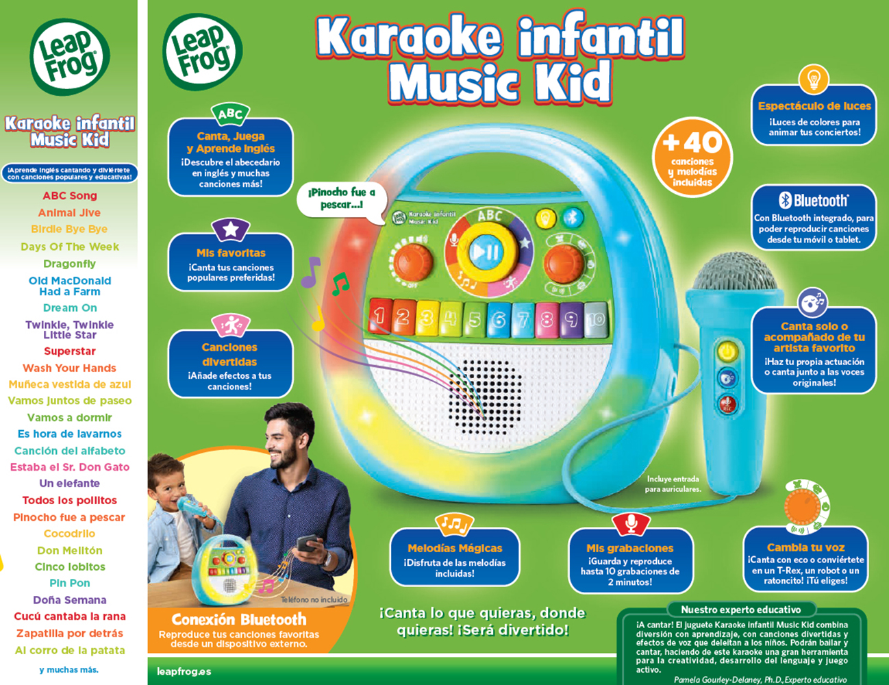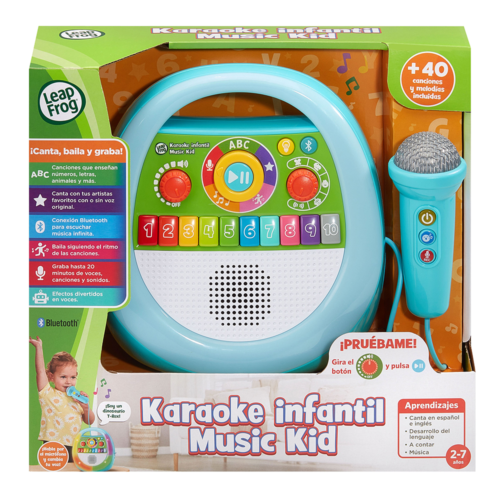Karaoke infantil con luces y micrófono. Juguete para niños a partir de 2 años. Este mini-escenario pone a tu peque al frente del espectáculo: 30 canciones y 10 melodías (educativas, tradicionales, para bailar y relajarse) iluminan el panel mientras el micrófono capta cada nota. Con la opción mágica pueden silenciar la voz original y ser los cantantes principales, o grabar hasta diez pistas de dos minutos y escuchar cómo suena su propia versión con divertidos efectos de voz, reforzando confianza y pronunciación. El Bluetooth permite traer sus temas favoritos, y los 45 minutos de música integrada garantizan diversión incluso sin conexión. Las luces rítmicas animan a moverse, el asa facilita llevar la fiesta a cualquier parte y la entrada de auriculares ofrece un momento de calma cuando hace falta. Volumen regulable y desconexión automática para un juego seguro y sin sorpresas.