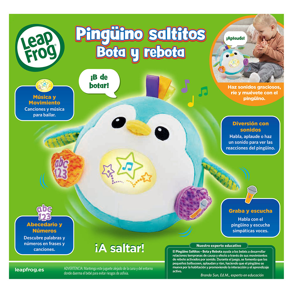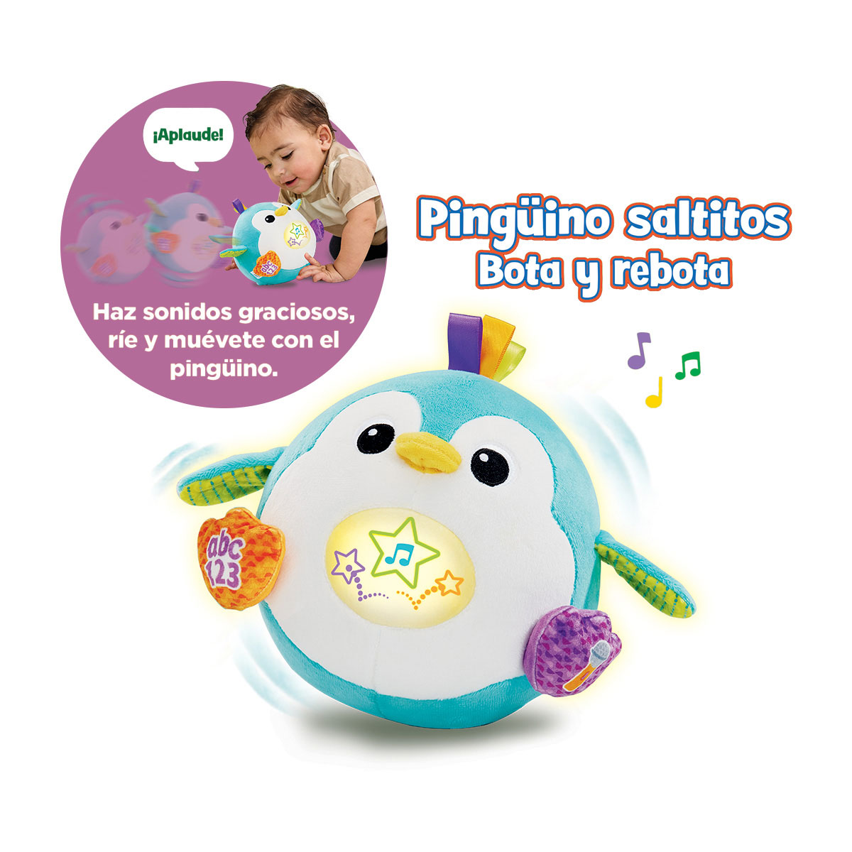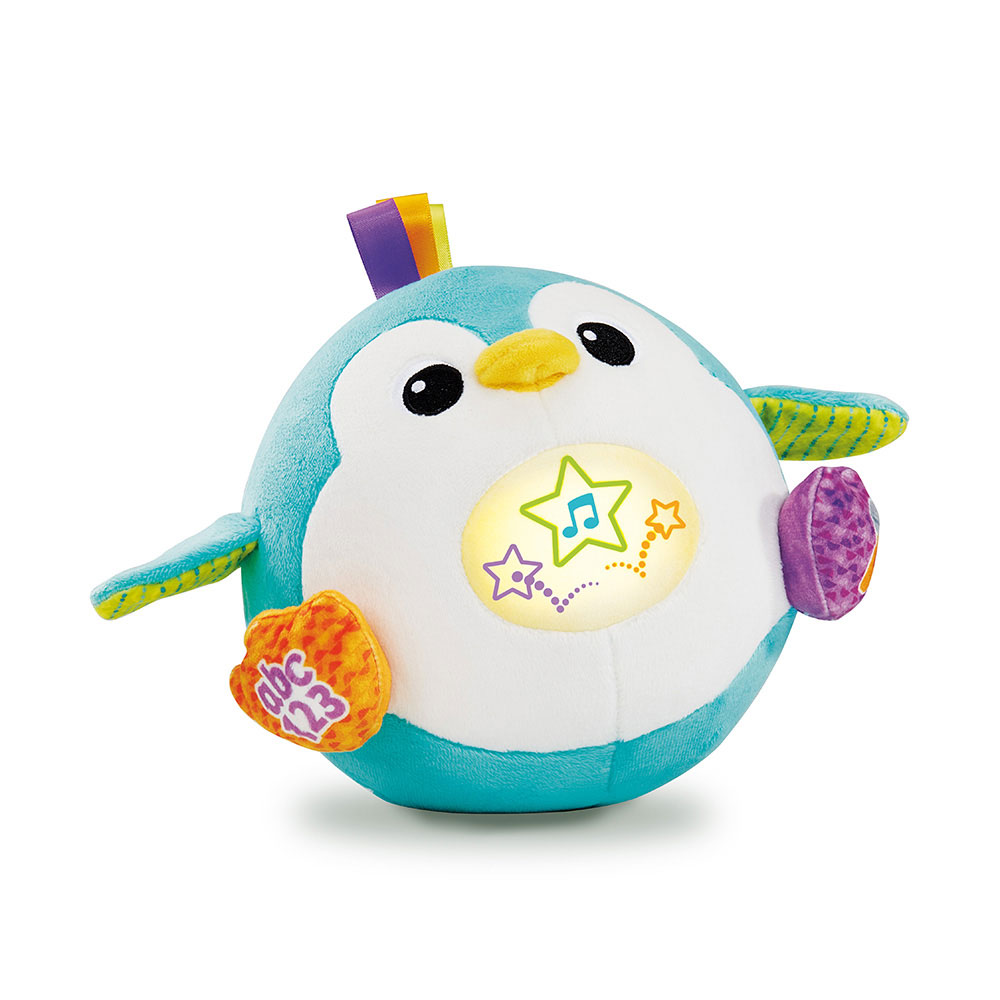 Pingüino interactivo con movimiento y voz para bebés +12 meses. Incluye 3 actividades de juego y botones para activar melodías, canciones y frases, con estrella iluminada en el ombligo, botón ABC en el pie izquierdo y botón de micrófono en el pie derecho.
