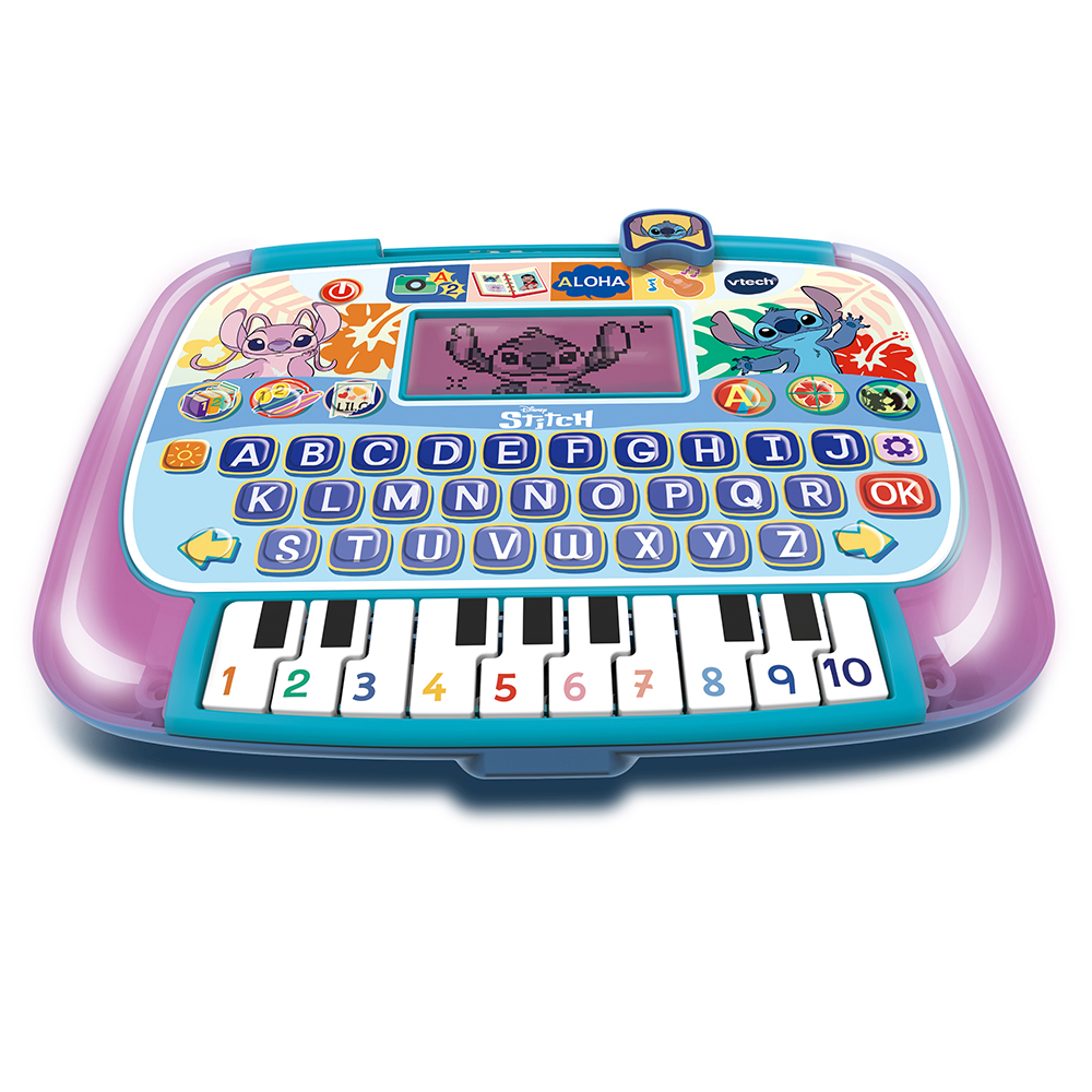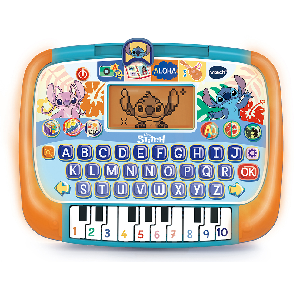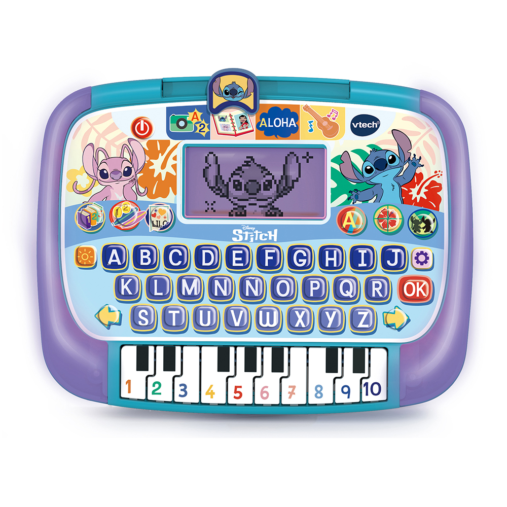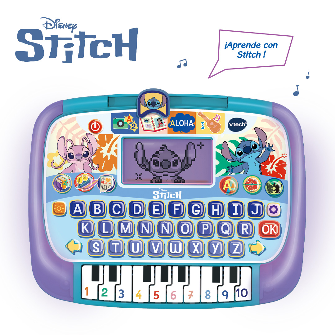 ¡Stitch convierte cada toque en aprendizaje galáctico! La pantalla retroiluminada cobra vida con animaciones y un borde que cambia de color para celebrar cada logro. Diez actividades repartidas en cuatro modos enseñan letras, números, primeras sumas, vocabulario y música, mientras los tres niveles de dificultad permiten avanzar paso a paso. El teclado alfabético refuerza el reconocimiento de letras y la coordinación mano-ojo, y las 10 teclas de piano animan a crear melodías y distinguir notas. Juegos de preguntas y memoria ponen a prueba lo aprendido con las voces originales de la serie, fomentando atención y rapidez mental. Diseño robusto, apagado automático y tamaño perfecto para llevar la diversión y el estudio a cualquier parte.
