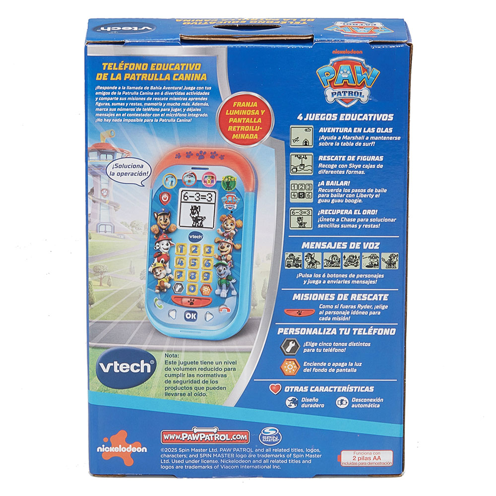 ¡Ring-ring, la Patrulla Canina necesita tu ayuda! La pantalla se ilumina en seis colores mientras Chase, Marshall, Skye y sus amigos envían mensajes de voz que animan a jugar. Cuatro misiones convierten los números en aventuras: sopla al micrófono para inflar el salvavidas de Marshall, guía a Skye para rescatar figuras, sigue la secuencia de Liberty para bailar y ayuda a Chase a recuperar monedas resolviendo sumas y restas. Con el botón Misiones eliges al cachorro adecuado y refuerzas la lógica y la memoria. El teclado de diez cifras enseña a contar y marcar “como los mayores”, y la activación por voz invita a responder y grabar frases, potenciando el lenguaje. Personaliza tono de llamada, música de fondo y brillo; la carcasa resistente y la desconexión automática garantizan diversión segura y lista para la próxima emergencia.