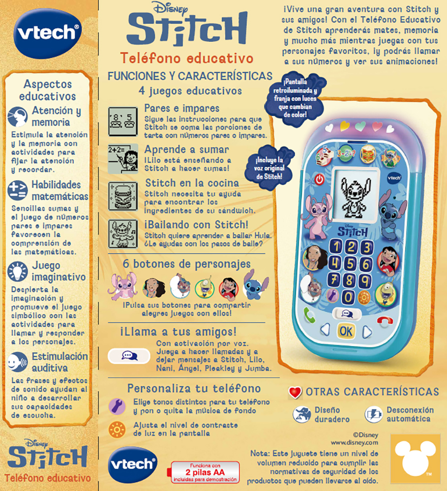 ¡Lilo y Stitch están al otro lado de la línea! La pantalla LCD y la banda luminosa de seis colores se iluminan mientras el peque marca el botón “Llamar” y recibe divertidos mensajes con las voces originales. Cuatro minijuegos convierten los números en aventuras: ayudar a Stitch a diferenciar pares e impares para conseguir tarta, sumar y restar frutas, contar ingredientes de sándwiches o pulsar cifras a toda prisa para que baile sin perder el paso. Cada reto refuerza el conteo, las primeras sumas y la rapidez mental, mientras el teclado de diez dígitos y los botones de dirección afianzan la coordinación mano-ojo. Con la activación por voz pueden charlar con Stitch y dejarle recados; además, el niño personaliza tono de llamada, música de fondo y brillo de pantalla para hacer suyo el teléfono. Robusto y con apagado automático, es el compañero perfecto para aprender matemáticas básicas, seguir instrucciones y dejar volar la imaginación “galáctica”.