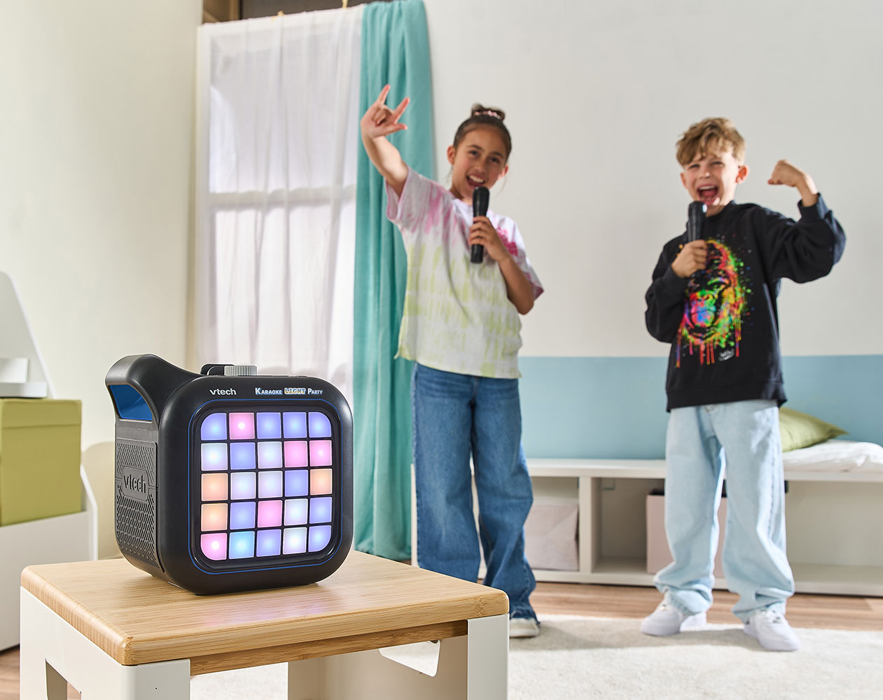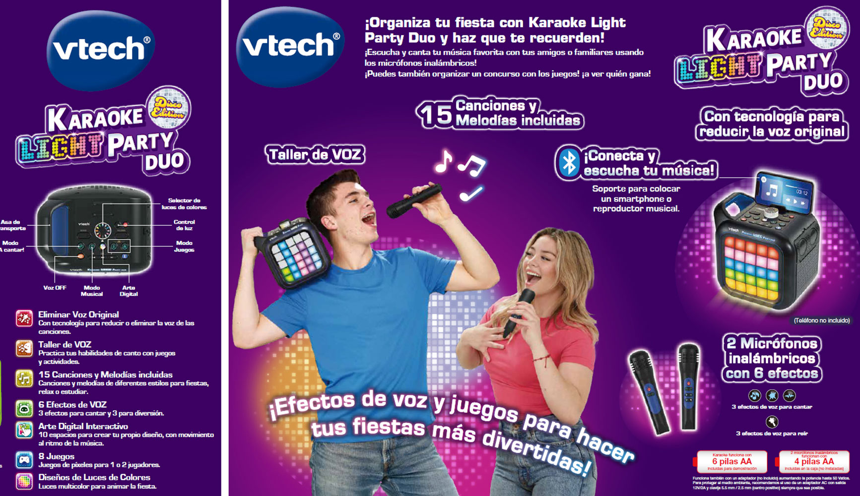 Conviértete en la estrella del salón con este altavoz-karaoke de 40 W, sonido nítido y potente. Sus dos micrófonos inalámbricos permiten cantar a dúo mientras los botones de vibrato, coros y cambio de voz añaden diversión y confianza escénica. Cinco modos y trece actividades musicales entrenan oído, ritmo y coordinación; el panel Pixel Art con 25 luces invita a crear animaciones al compás. Diez melodías y cinco canciones integradas o tus temas vía Bluetooth, con soporte para móvil, despiertan el gusto musical. La función de cancelación vocal te convierte en solista; asa y soportes plegables facilitan llevarlo. Funciona con 6 pilas AA o adaptador 12 V, control de volumen y apagado automático.