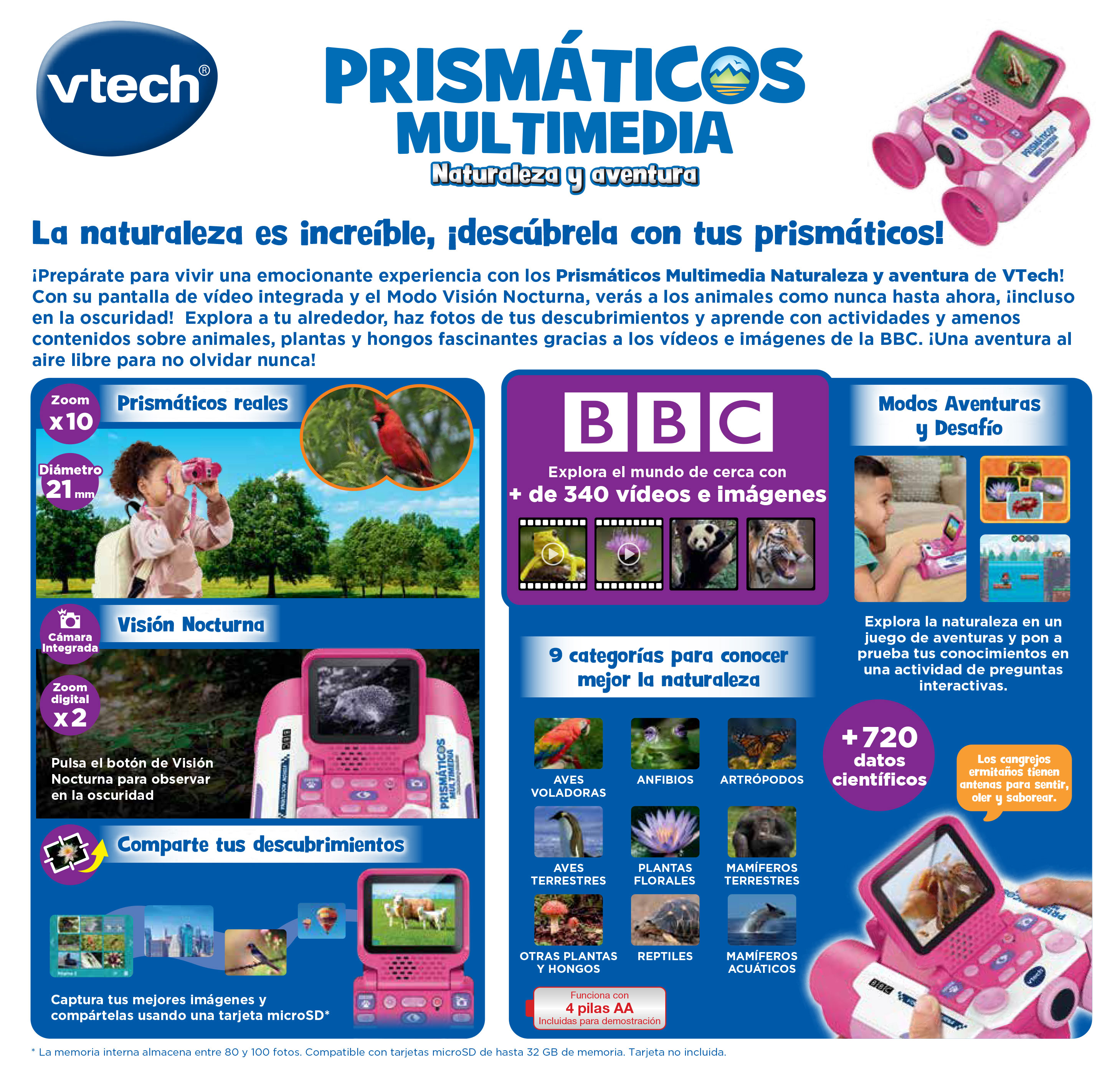 Prismáticos 10x21 con pantalla inclinable a color 2.4”, cámara y un diseño ergonómico. 6 modos de juego. Descubre más de 700 datos sobre animales, flora y fauna con 340 fotografías y vídeos educativos de la prestigiosa cadena de televisión inglesa.