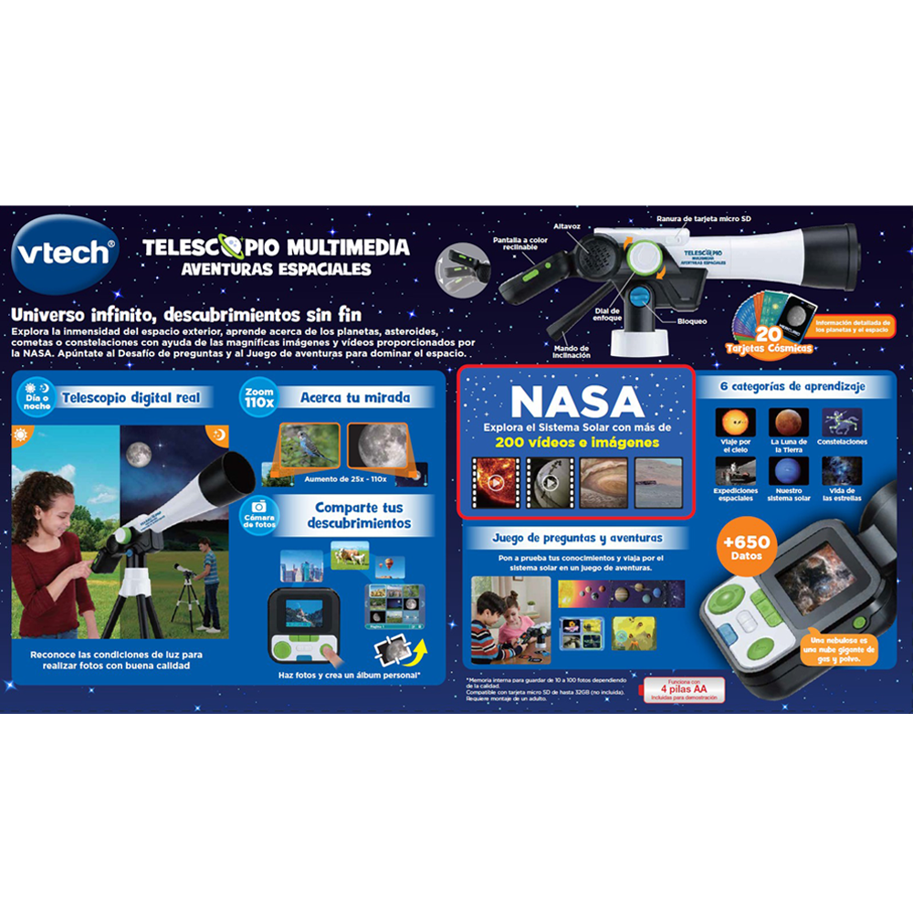 • Explora el cielo con un telescopio real donde podrás ver las estrellas y las constelaciones en una pantalla de vídeo de 2.4 pulgadas a color