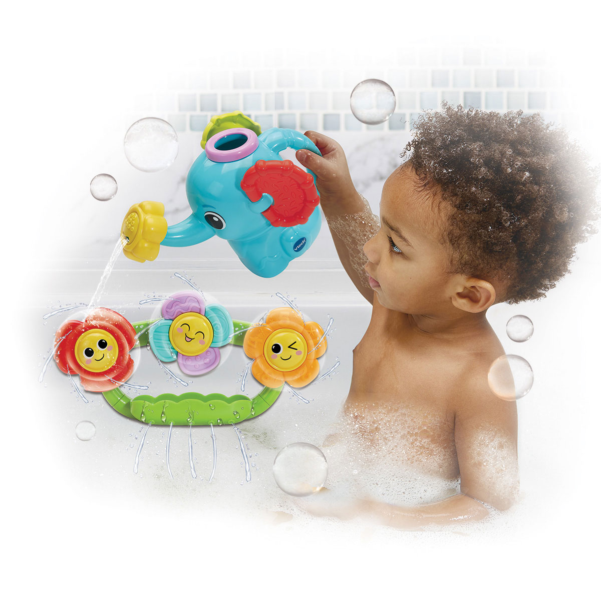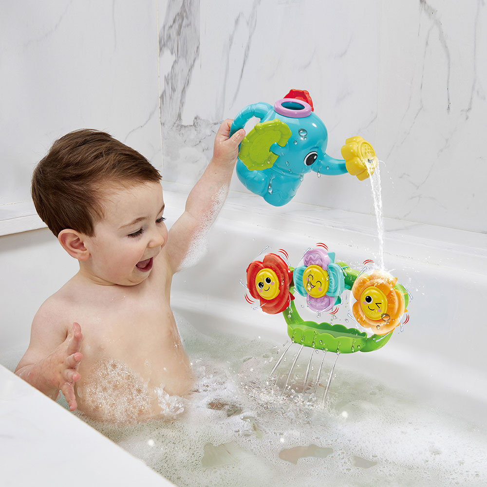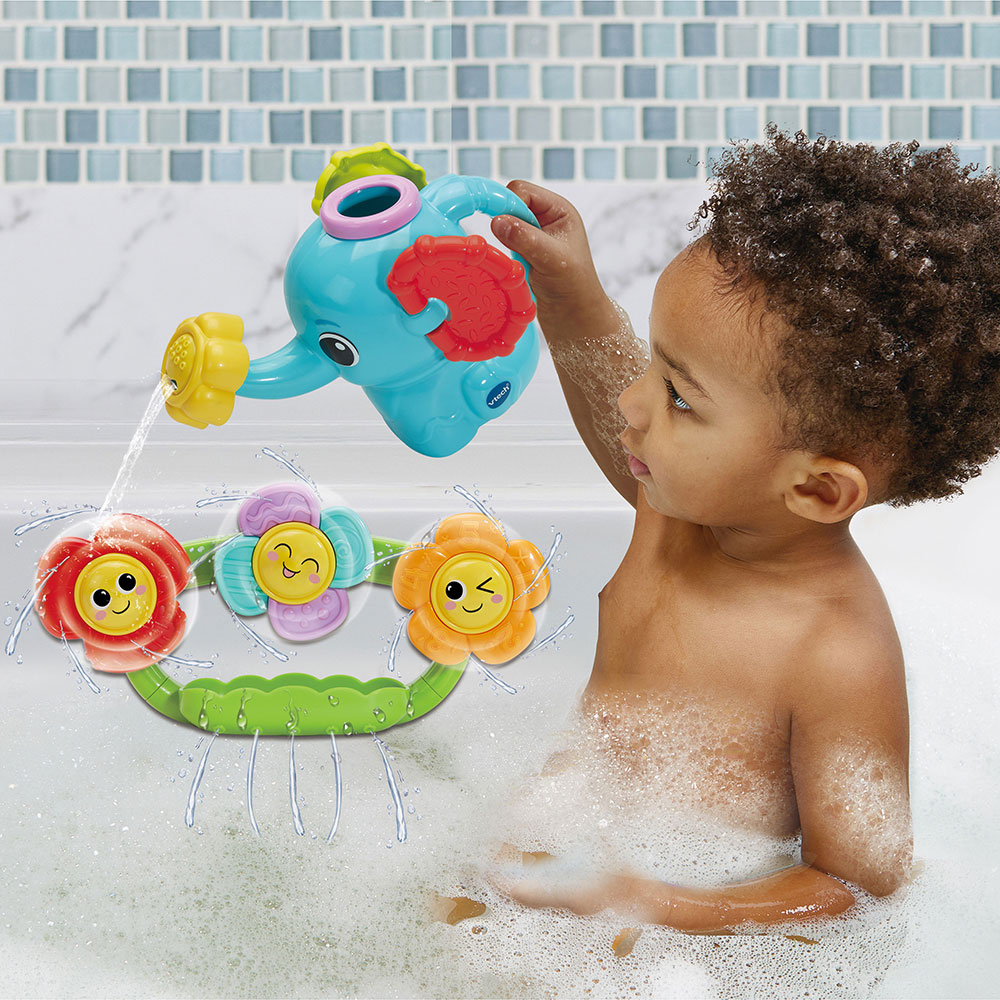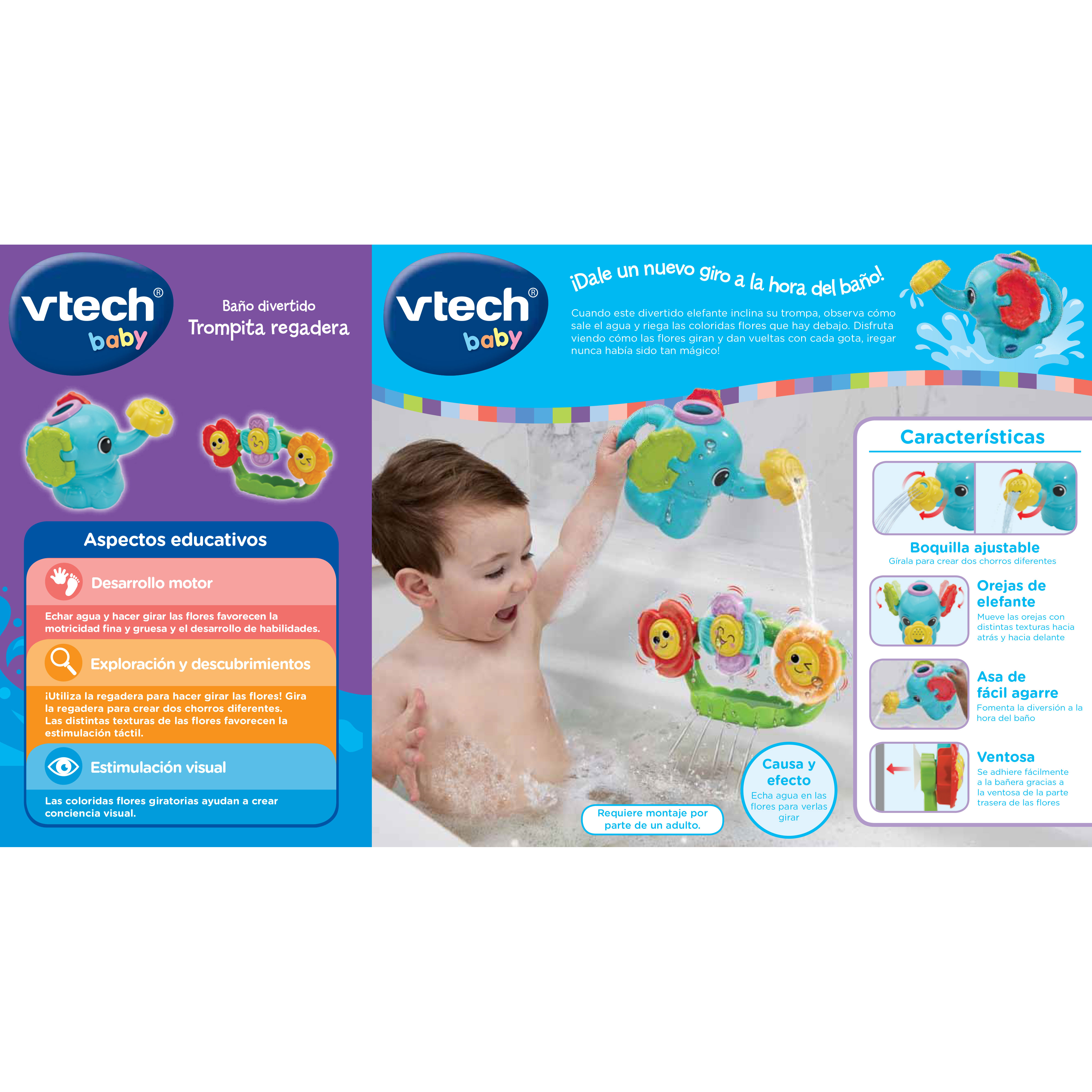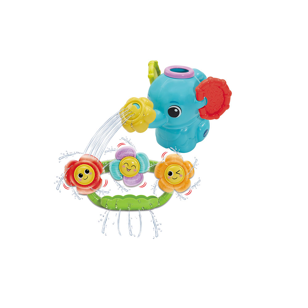 Divertido juguete de baño con actividades que estimulan los sentidos y la motricidad del bebé. Incluye una regadera en forma de elefante con dos tipos de chorro y flores con pétalos texturizados que se adhieren con ventosa y giran al caer el agua. Ideal para desarrollar la coordinación mano-ojo y hacer del baño un momento de juego, sin componentes electrónicos.