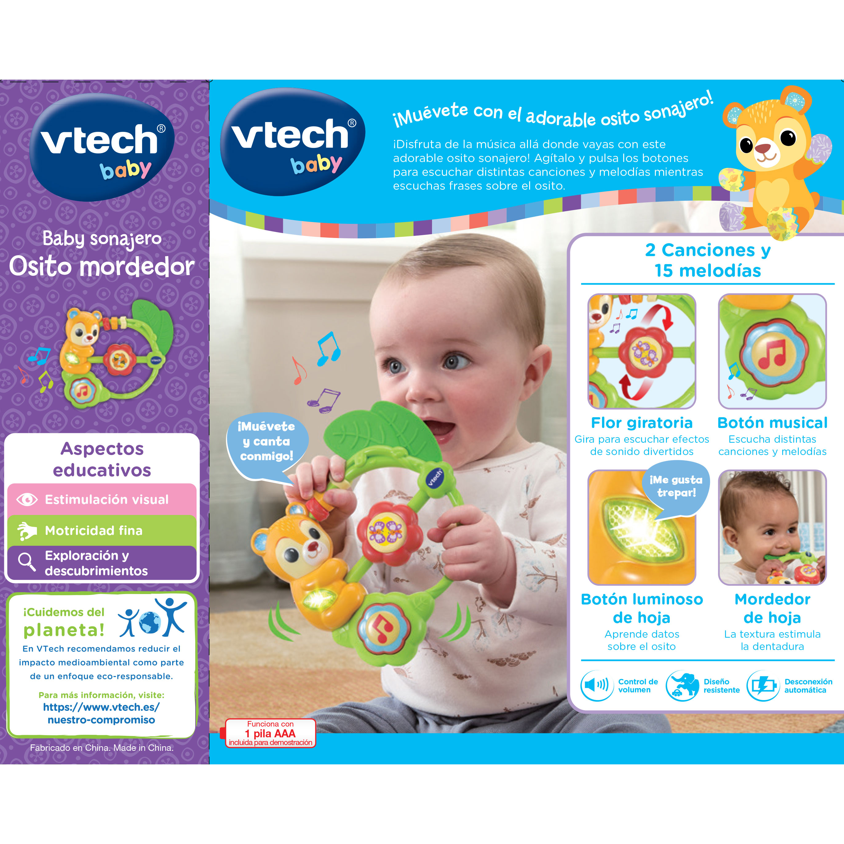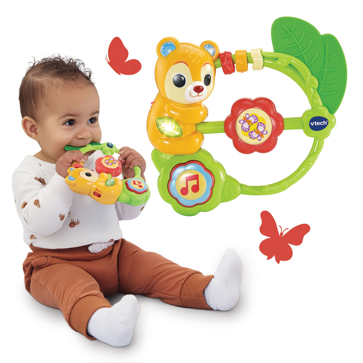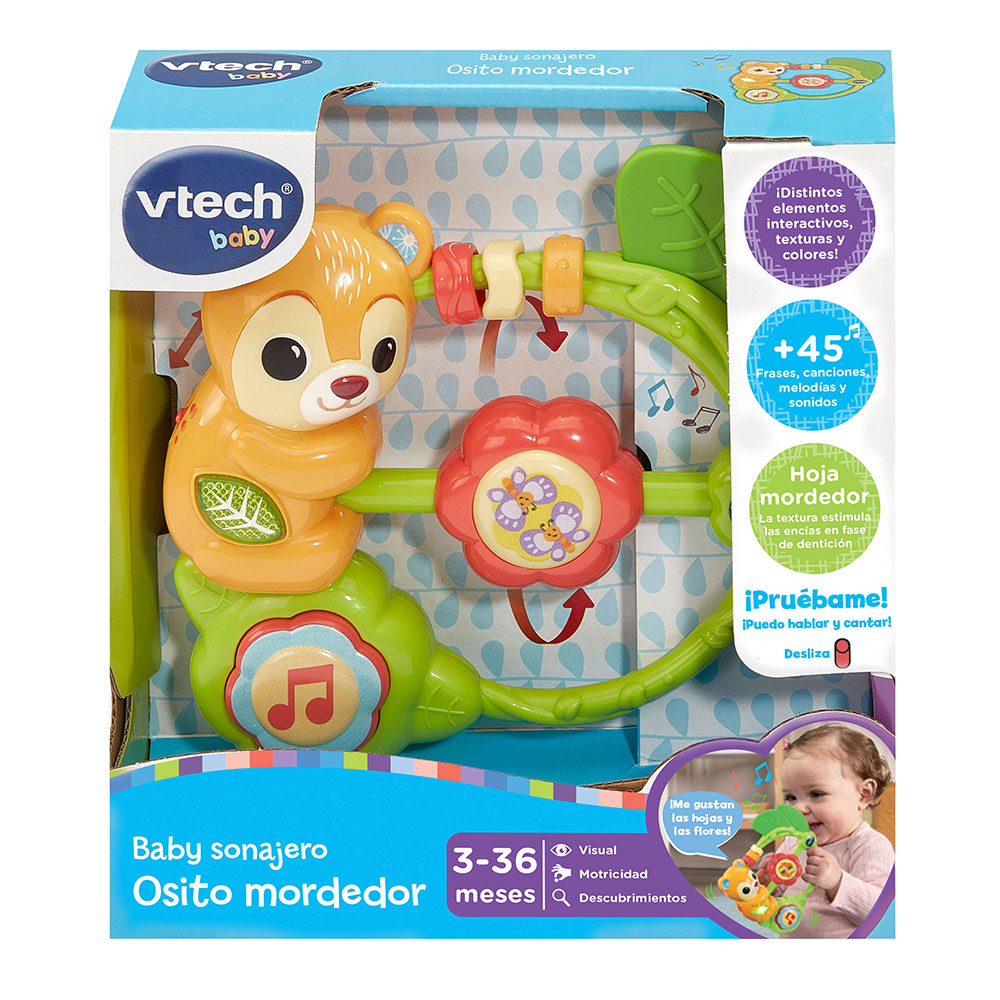 Pequeño sonajero interactivo de osito para bebés +3 meses. Cuenta con sensor de movimiento para activar divertidos sonidos.
