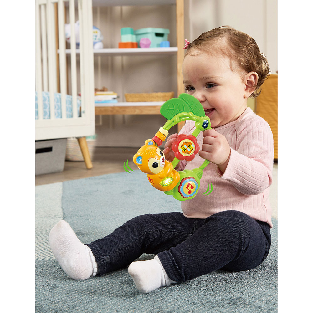 Pequeño sonajero interactivo para bebés, con ábaco y anillos de colores que ayudan a desarrollar la motricidad fina. Incluye lámina de dentición, sensor de movimiento y flor giratoria que activan sonidos divertidos, además de botones luminosos con frases, canciones y melodías. Cuenta con desconexión automática para un uso seguro.