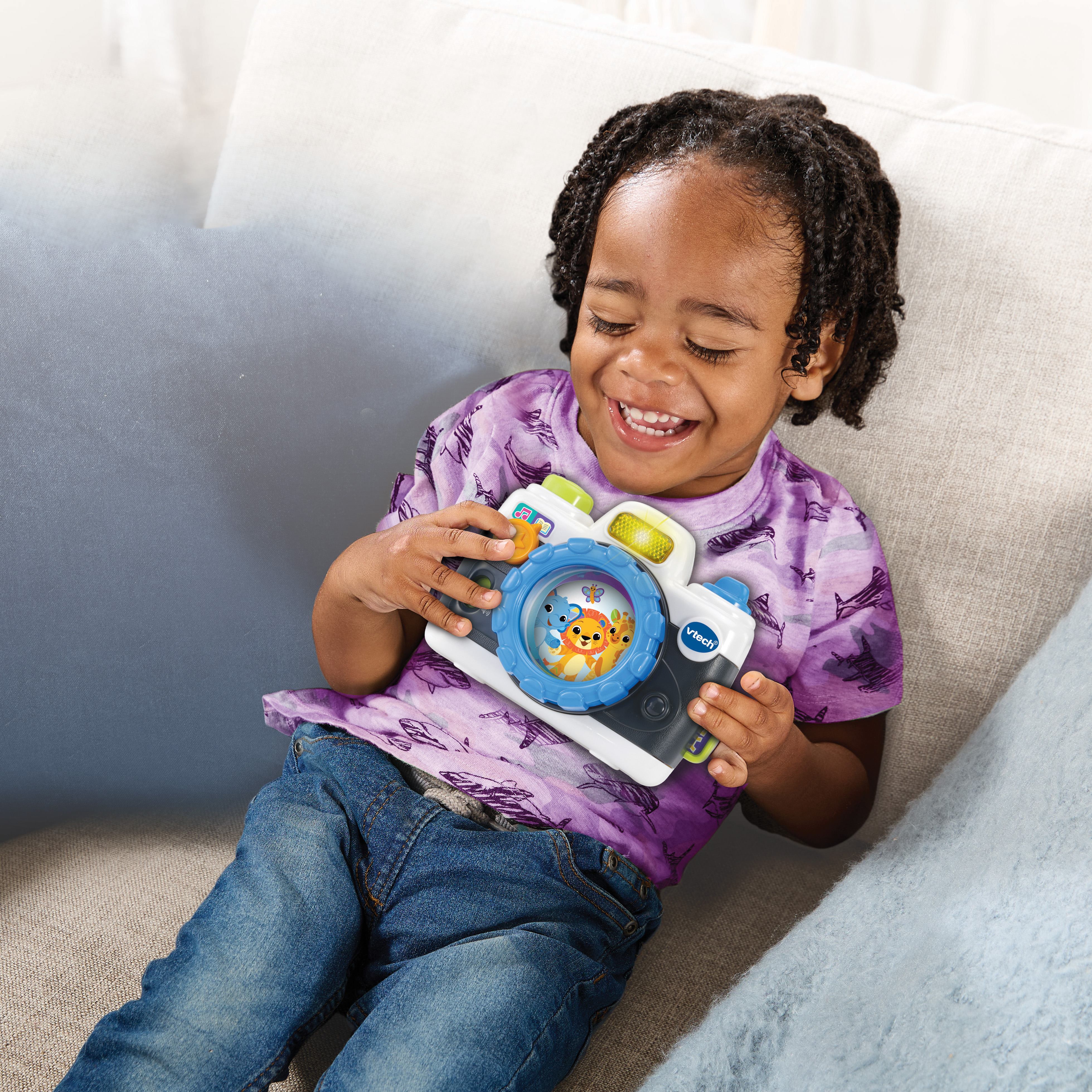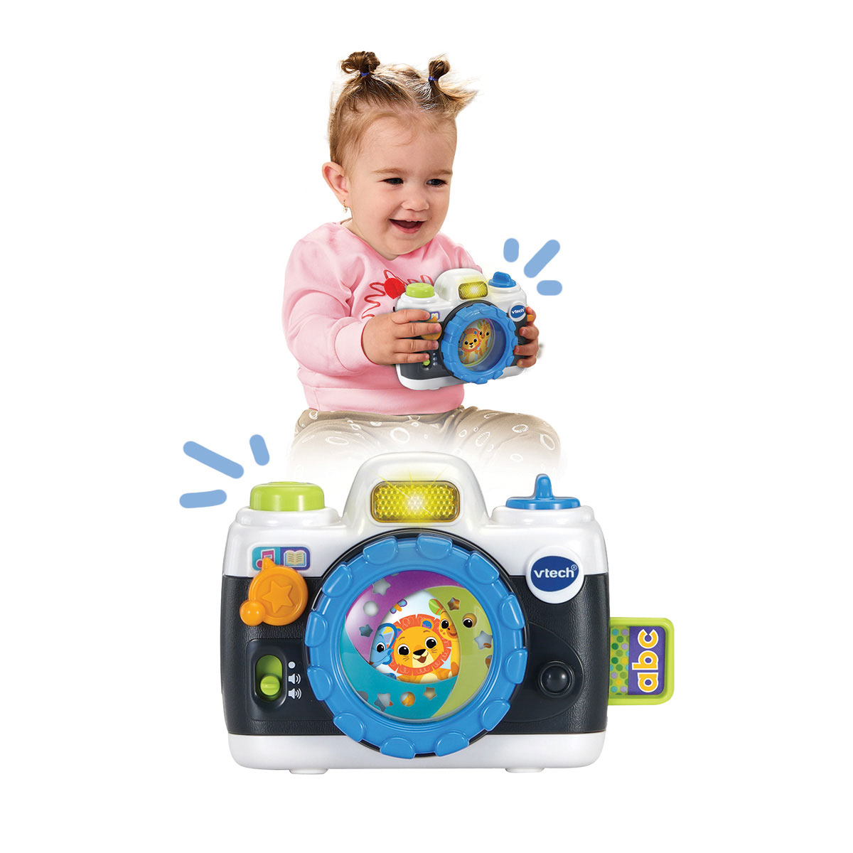 Cámara interactiva de estilo retro para descubrir el mundo como un auténtico reportero. El objetivo giratorio simula el zoom y activa sonidos de cámara, canciones y melodías, con dos modos de juego: aprendizaje y música. Incluye rueda giratoria y tarjeta SD que salta al pulsarla para una experiencia más realista. Ideal para bebés +9 meses.