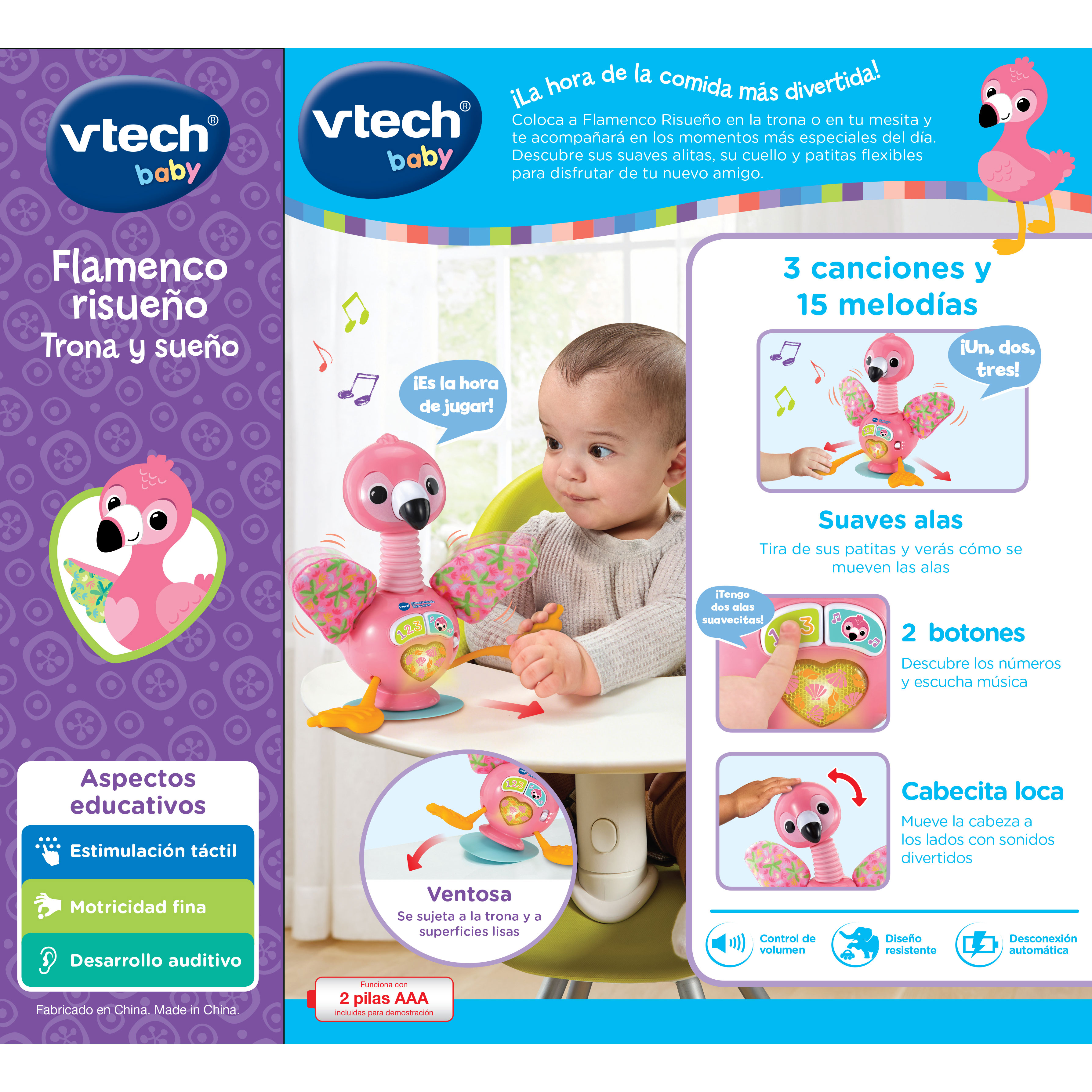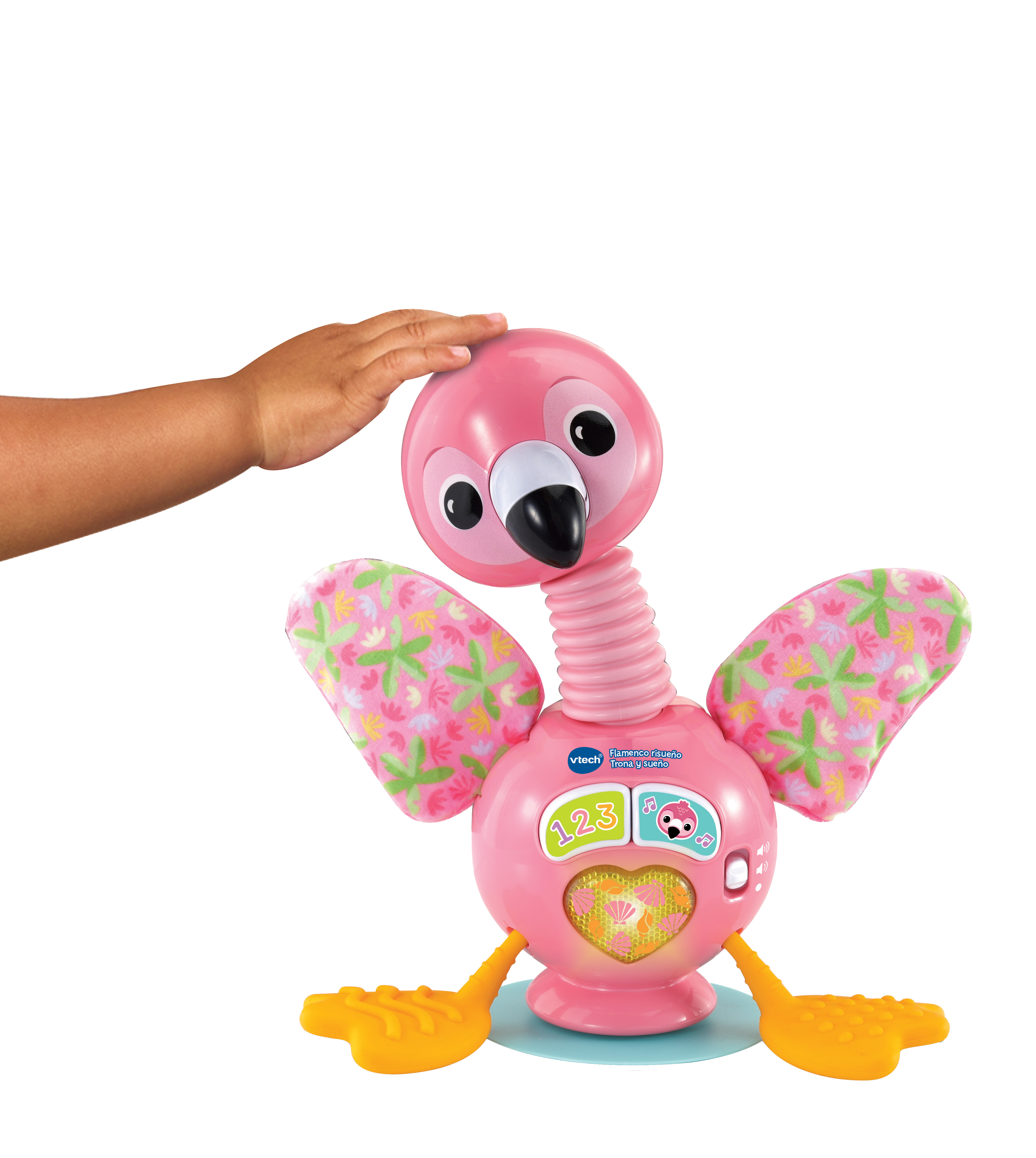 Flamenco rosa interactivo que acompaña al bebé durante la hora de comer y estimula sus sentidos con alas de tela, cuello flexible y patas de silicona texturizadas. Al tirar de las patitas se mueven las alas, se ilumina el corazón y se activan sonidos, melodías y frases educativas. Incluye base con ventosa para una sujeción firme y desconexión automática.