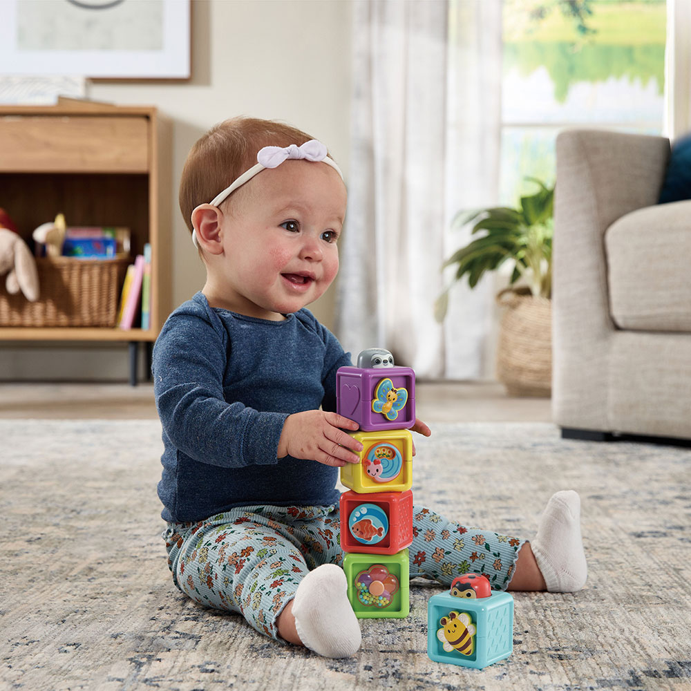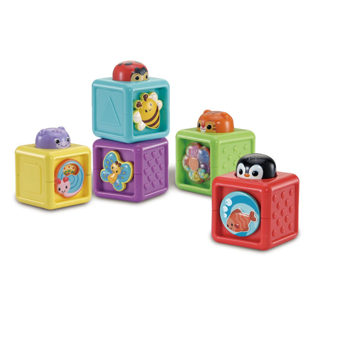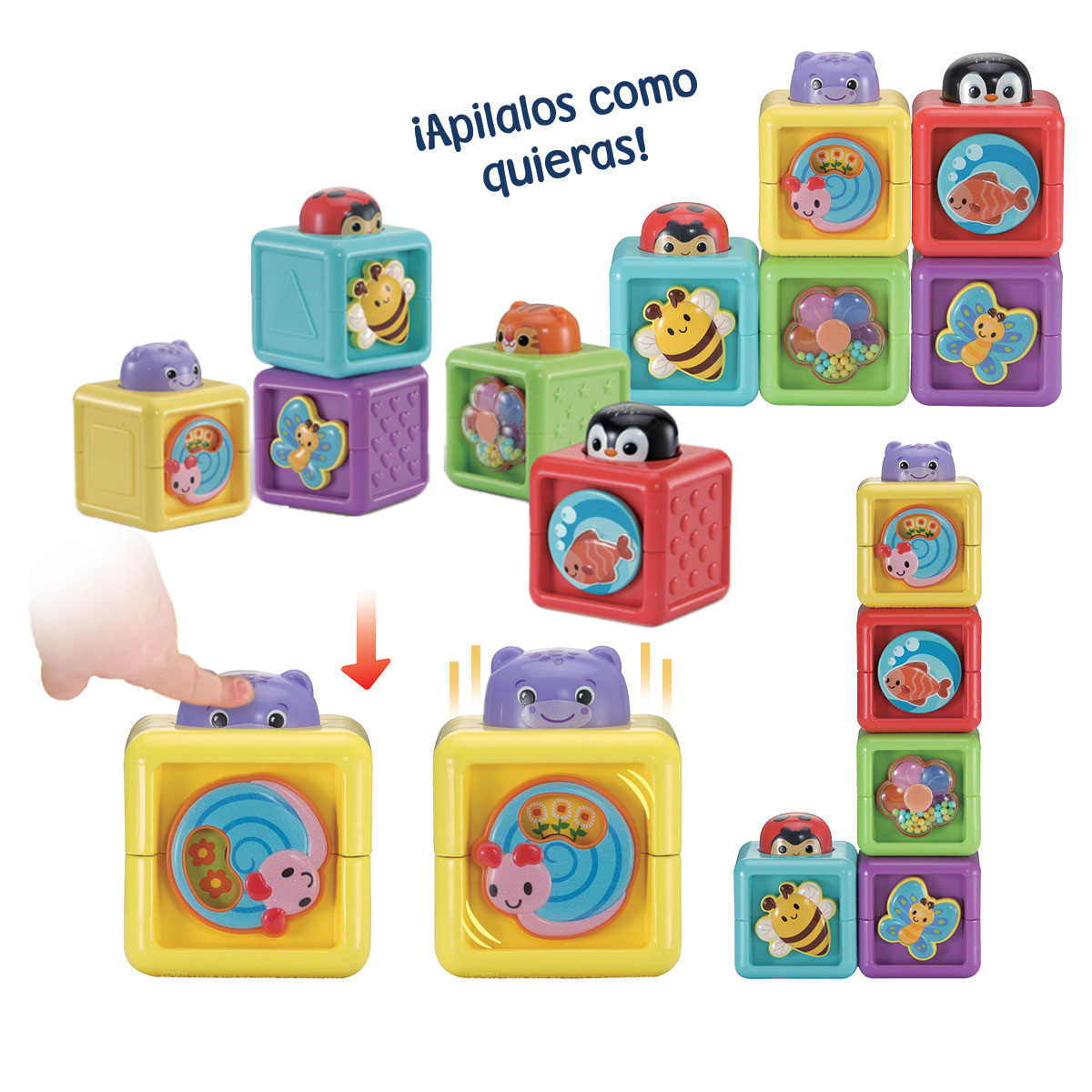 CUBOS APILABLES: Los cubos son fáciles de apilar gracias a las cabezas redondeadas de los animales que guían a los niños en el proceso de construcción. Al apilar los cubos, las cabezas de los animales provocan reacciones en cadena.