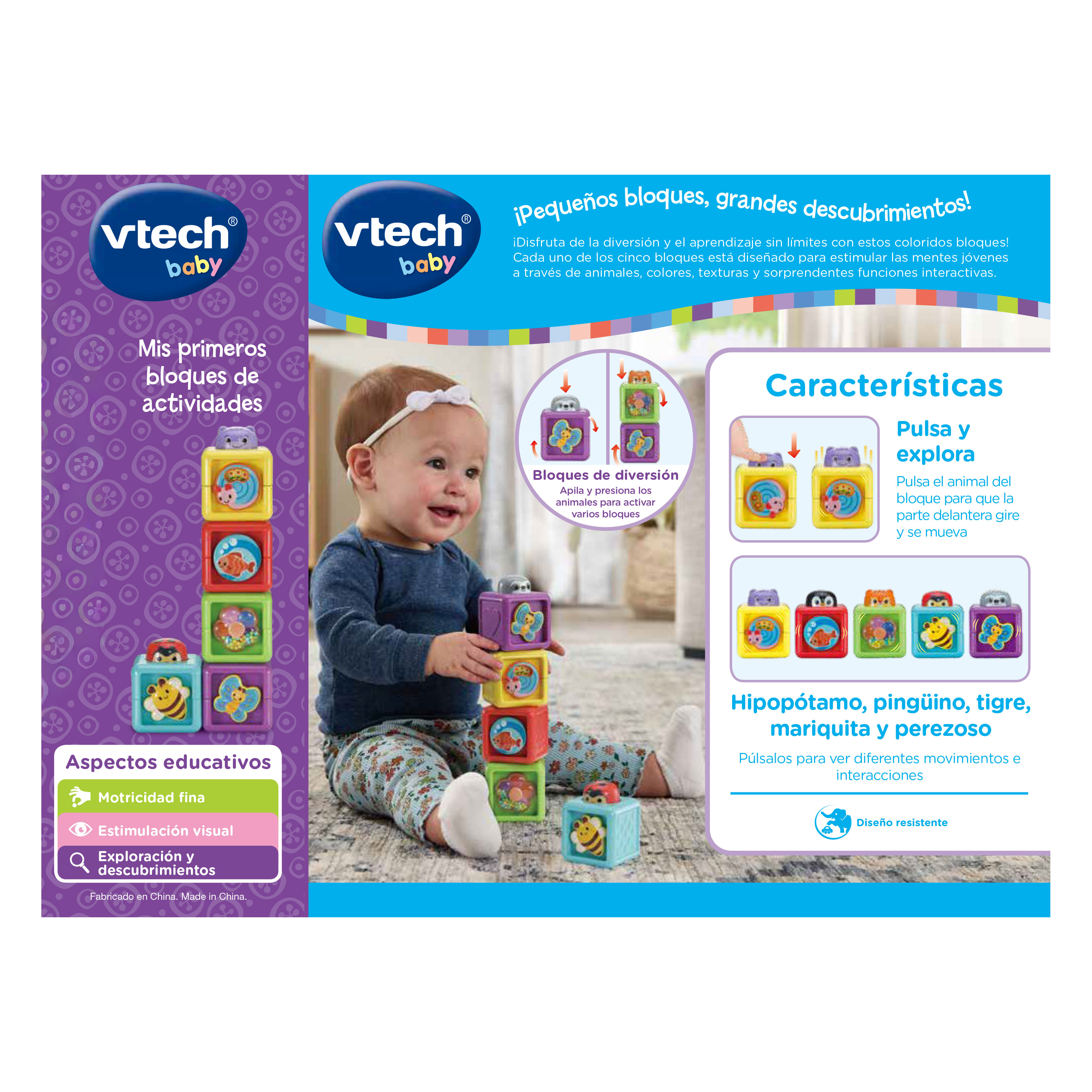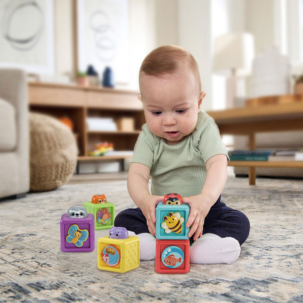 Pack de 5 cubos interactivos no electrónicos con múltiples actividades: rodillo, mariposa giratoria, cuentas para agitar y más, que fomentan la coordinación ojo-mano y la curiosidad. Ideal para explorar, manipular, apilar y aprender a su propio ritmo.
