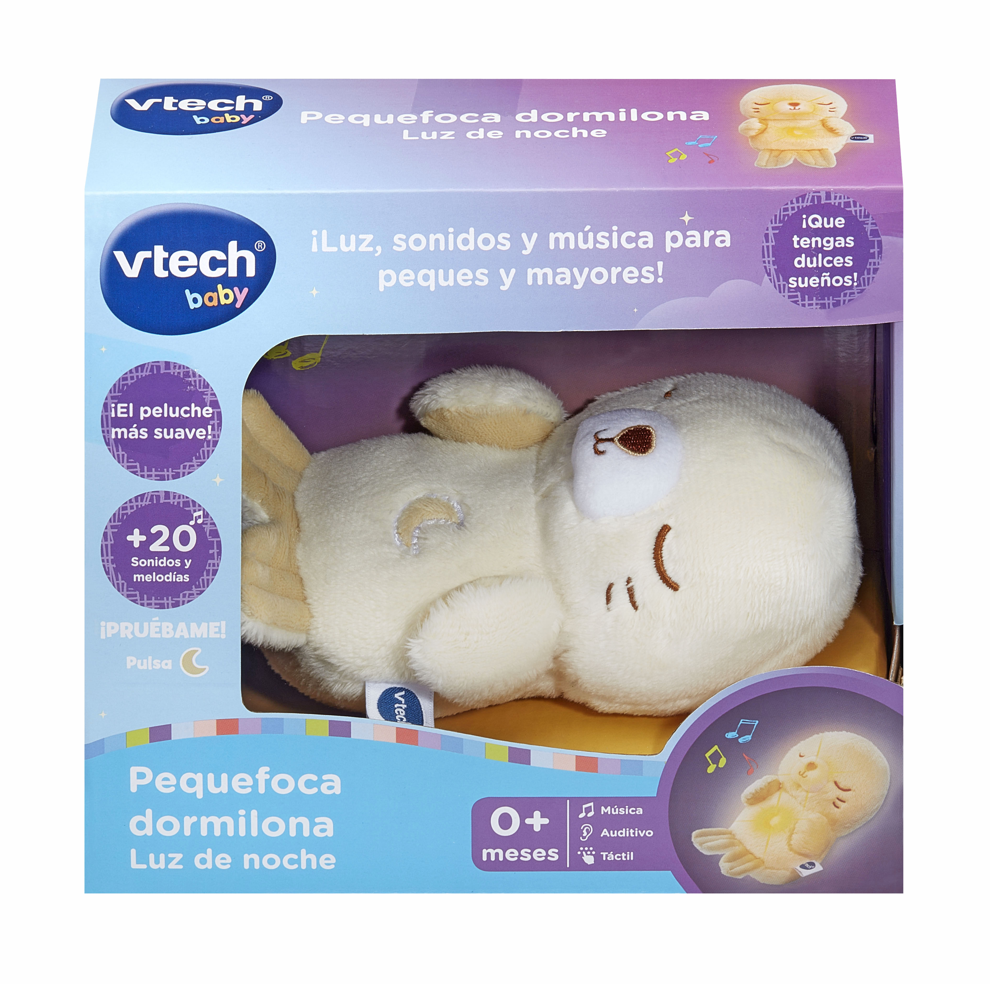 Foca de peluche para bebés +0 meses. Las melodías duran 15 minutos antes de apagarse automáticamente. Su tamaño compacto permite llevarlo a cualquier lugar. El módulo electrónico se puede extraer para lavar el peluche en la lavadora.