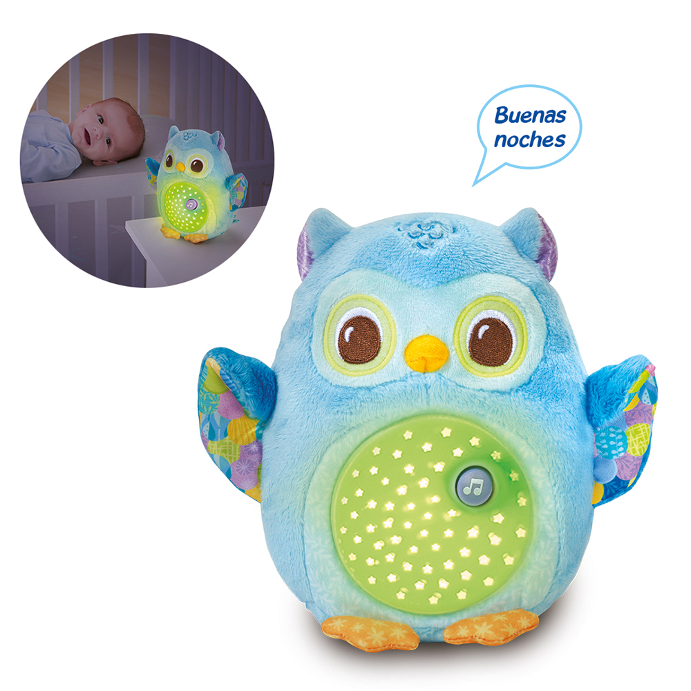 ¡El amiguito búho más suave y adorable! Su tripita luminosa proporciona un ambiente relajante para el bebé. Sus canciones, melodías, sonidos de la naturaleza y suave ruido blanco ayudan a calmar al bebé mientras sus diferentes texturas favorecen la estimulación táctil. Su botón musical activa sonidos relajantes, 3 canciones y melodías. El búho también detecta cuando el bebé está llorando y activa melodías.